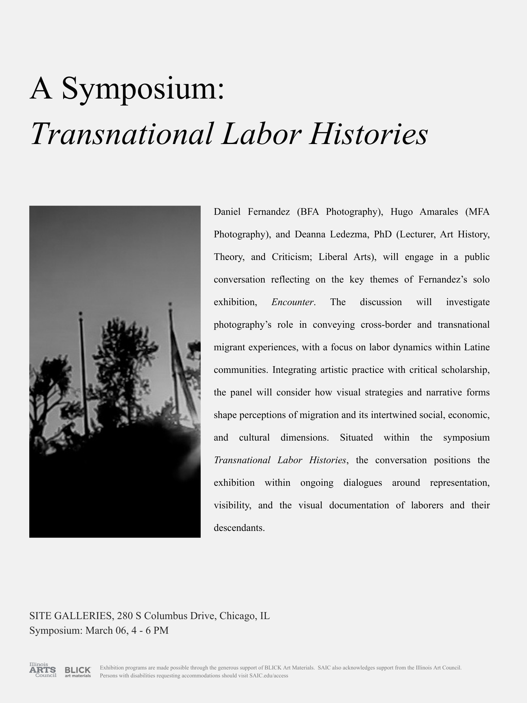 “Daniel Fernandez (BFA Photography), Hugo Amarales (MFA Photography), and Deanna Ledezma, PhD (Lecturer, Art History, Theory, and Criticism; Liberal Arts), will engage in a public conversation reflecting on the key themes of Fernandez’s solo exhibition, Encounter. The discussion will investigate photography’s role in conveying cross-border and transnational migrant experiences, with a focus on labor dynamics within Latine communities. Integrating artistic practice with critical scholarship, the panel will consider how visual strategies and narrative forms shape perceptions of migration and its intertwined social, economic, and cultural dimensions. Situated within the symposrnm Transnational Labor Histories, the conversation positions the exhibition within ongoing dialogues around representation, visibility, and the visual documentation of laborers and their descendants.“