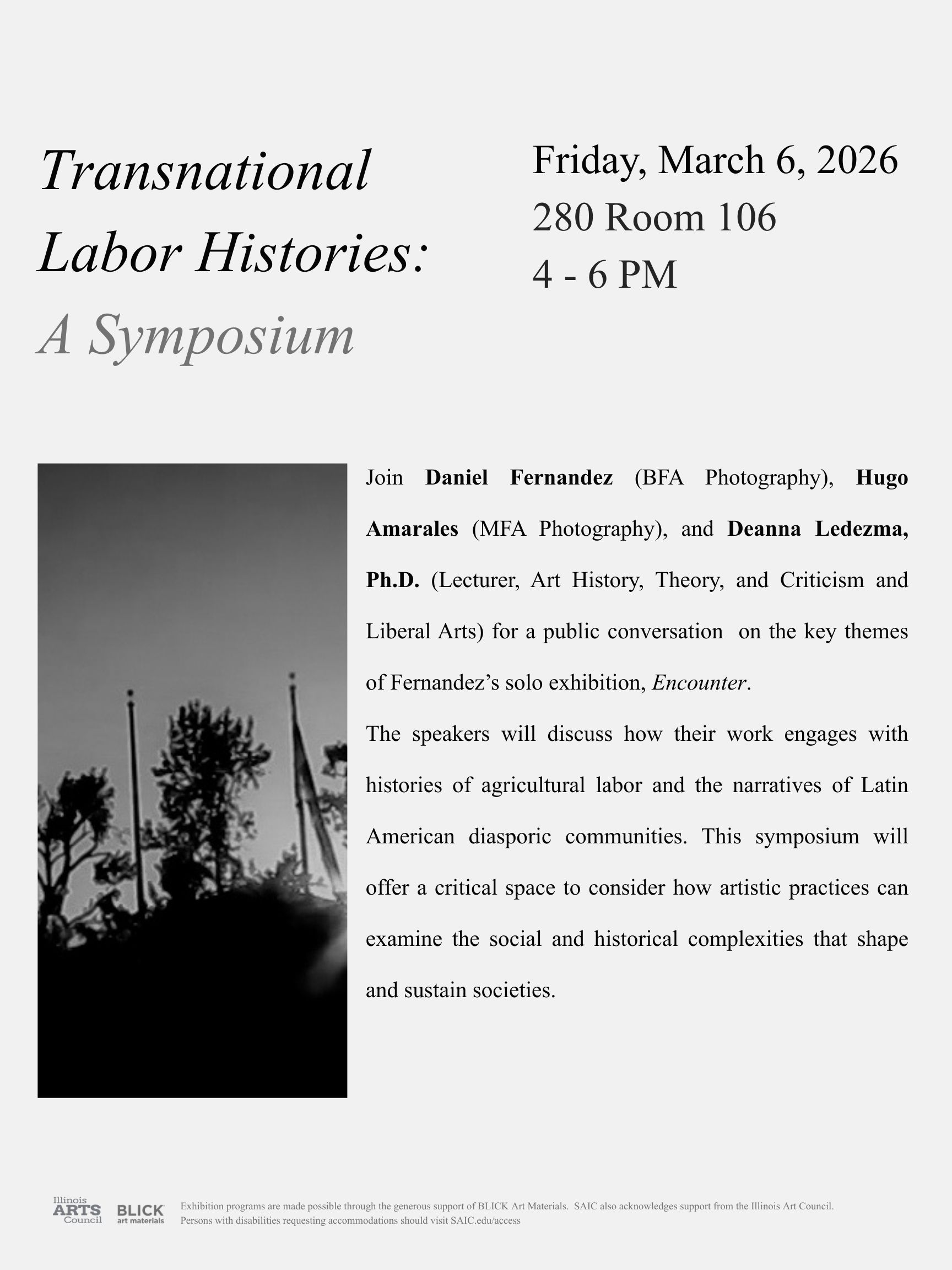 “Daniel Fernandez (BFA Photography), Hugo Amarales (MFA Photography), and Deanna Ledezma, PhD (Lecturer, Art History, Theory, and Criticism; Liberal Arts), will engage in a public conversation reflecting on the key themes of Fernandez’s solo exhibition, Encounter. The discussion will investigate photography’s role in conveying cross-border and transnational migrant experiences, with a focus on labor dynamics within Latine communities. Integrating artistic practice with critical scholarship, the panel will consider how visual strategies and narrative forms shape perceptions of migration and its intertwined social, economic, and cultural dimensions. Situated within the symposrnm Transnational Labor Histories, the conversation positions the exhibition within ongoing dialogues around representation, visibility, and the visual documentation of laborers and their descendants.“