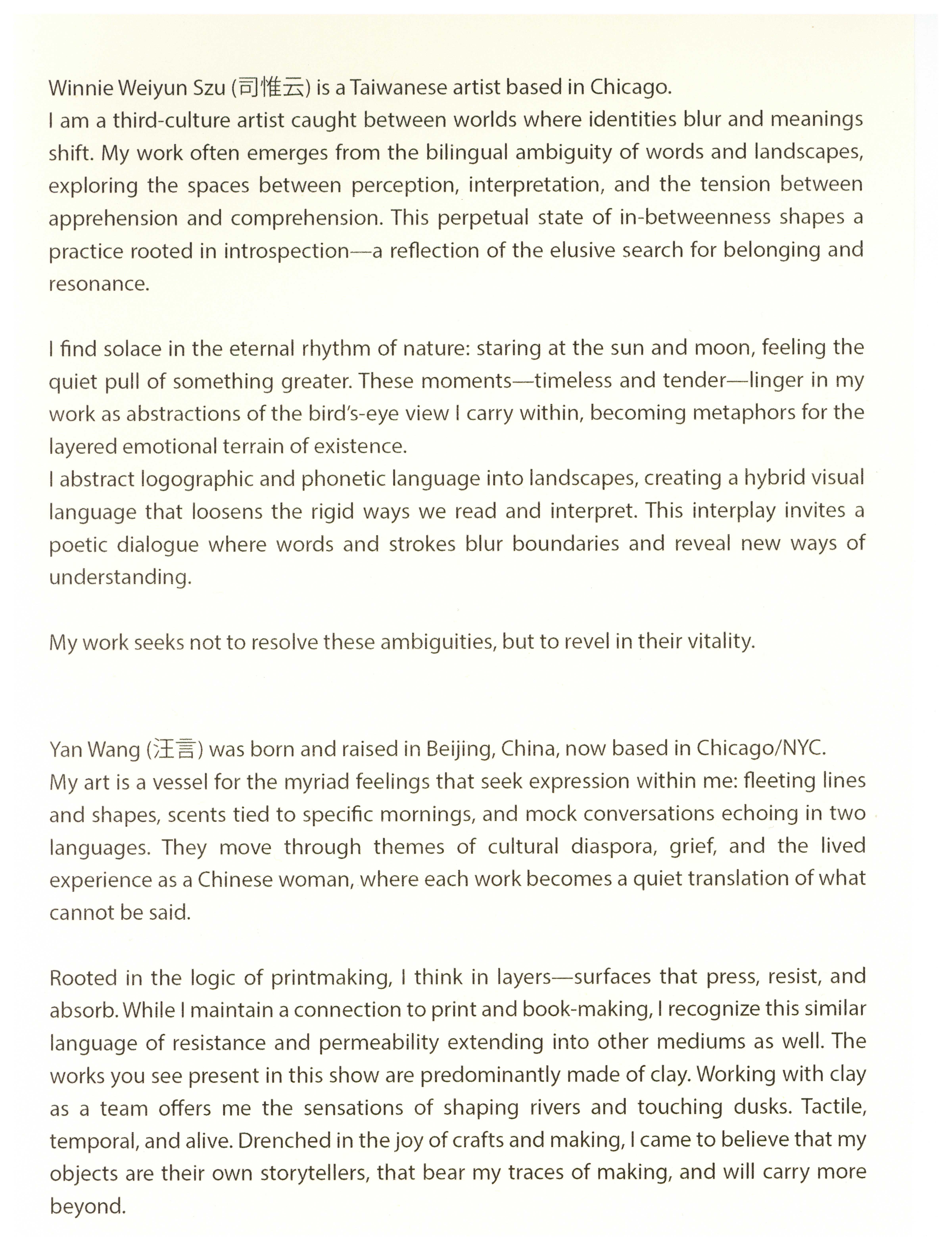 “To speak all that is known”—this is the promise within the phrase 知無不言. Yet knowing itself is never whole, and language trembles at its edges. Some truths blur with time, some memories fracture, and some inheritances weigh too deeply to surface in words. The phrase carries both longing and impossibility. What we can be told is never complete; what resists words still lingers in breath, gesture and touch. Through ceramics, artist books, painting, and moving image, Winnie and Yan weave a dialogue that drifts beyond language, tracing the quiet residues of trauma, migration and identity. What remains unspoken does not vanish—it gathers here, alive in texture, rhythm, and presence.