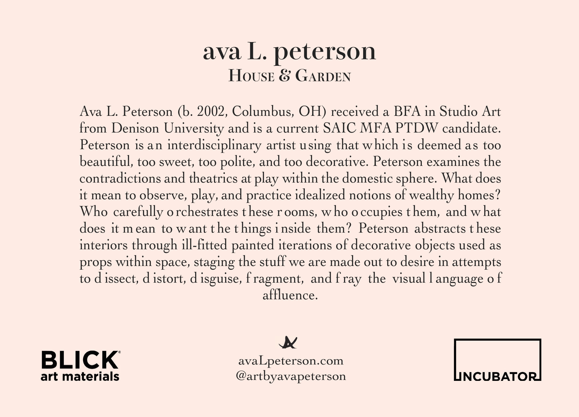 Ava L. Peterson (b. 2002, Columbus, OH) received a BFA in Studio Art from Denison University and is a current