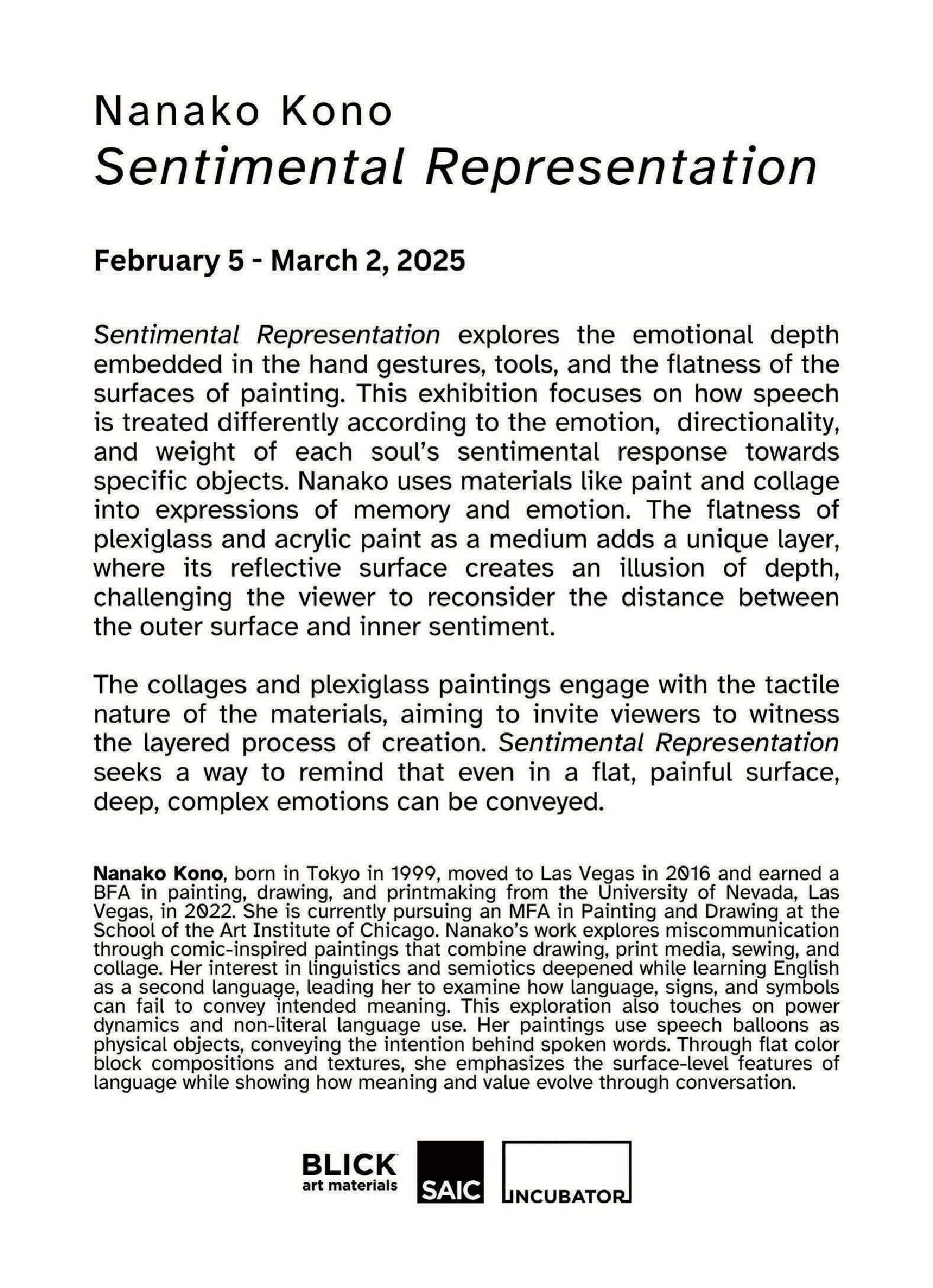 Sentimental Representation explores the emotional depth embedded in the hand gestures, tools, and the flatness of the surfaces of painting. The exhibition focuses on how speech is treated differently according to the emotion, directionality, and weight of each soul’s sentimental response towards specific objects. Nanko uses materials like paint and collage into expressions of memory and emotion. The flatness of plexiglass and acrylic paitn as a medium adds a unque layer, where its reflective surface creates an illusion of depth, challenging the viewer to reconsider the distance between the outer surface and inner sentiment. The collages and plexiglass paintings engage with the tactile nature of the materials, aiming to invite viewers to witness the layered process of creation. Sentimental Representation seeks a way to remind that even in a flat, painful surface, deep, complex emotions can be conveyed.